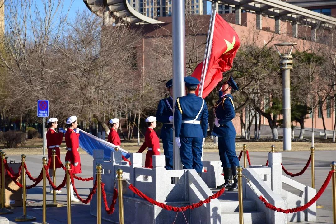 当雄壮的中华人民共和国国歌响起时,鲜艳的五星红旗冉冉升起,学校领导及民航师生一起奏唱国歌,注视着国旗缓缓升到空中,共同见证这样庄重而又神圣的时刻。